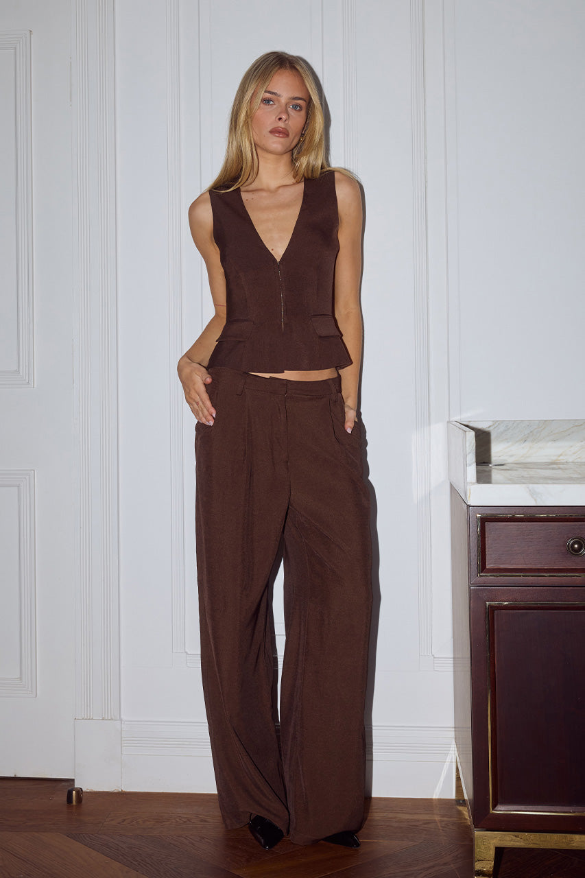 Our Arla Pants sits low on the waist, inspired by relaxed suiting for an effortless silhouette, pair with our Arla Vest Top for the complete look. – Wide leg- Low rise- Hook and fly closure- Unlined with stretch- 92% Polyester u0026 8% Spandex Please refer to care label for garment care instructions. Colours may appear slightly different to the website due to lighting, computer picture resolution and monitor settings. ~section~ – Length (Size S): 107cm/42inches. It is true to size. – If you need more help with sizing, see our size guide or email us at [email protected] ~section~ Kiana wears a size AU 6 / XS / US 2 and is 170cm tall.