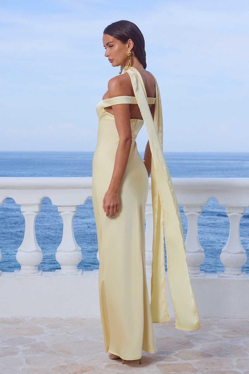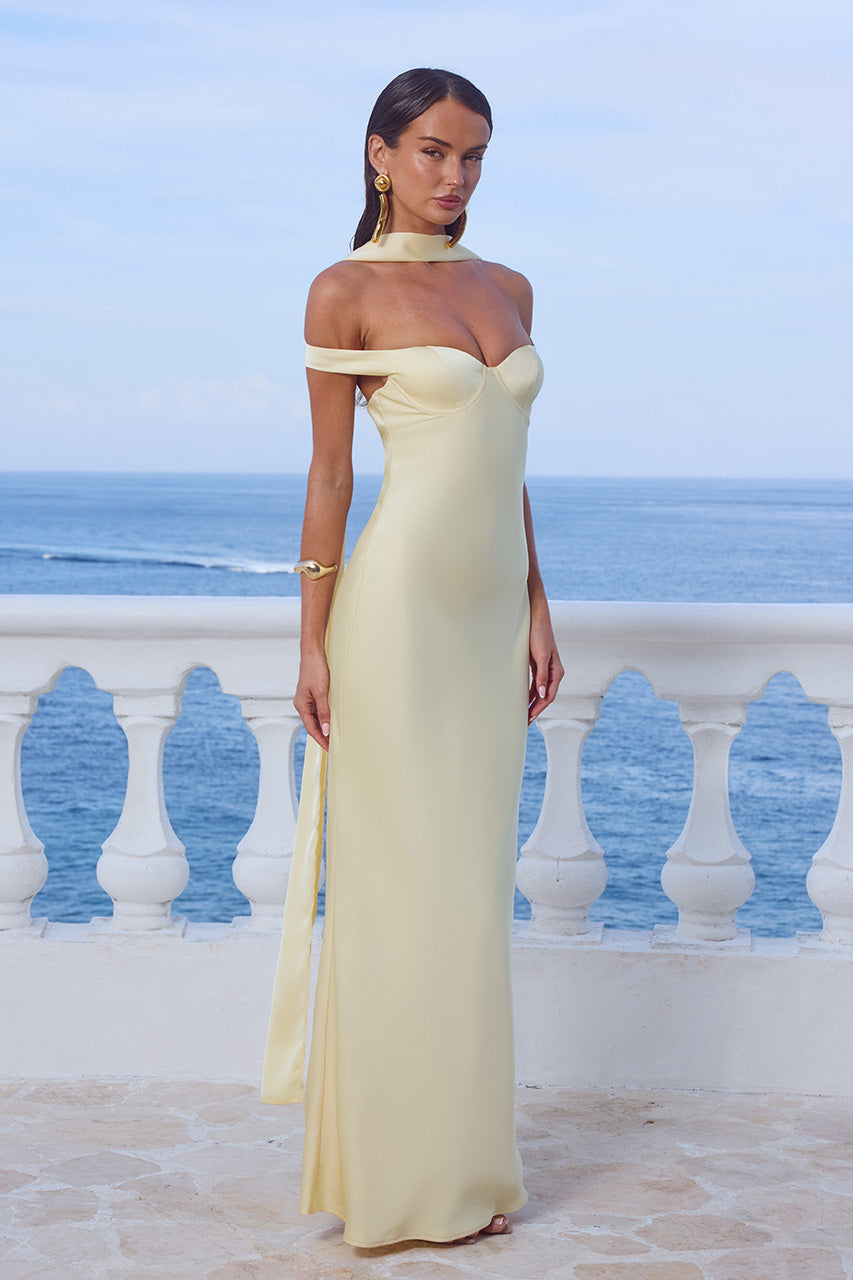 COMING SOON – Hold tight! This style will be yours by early September. With an off the shoulder neckline and scarf, our Raphaella Maxi Dress is feminine and flirty. – Maxi length- Underwire- Centre back invisible zipper- Lined, non-stretch- Body: 97% Polyester u0026 3% Spandex, Lining: 100% Polyester Please refer to care label for garment care instructions. Colours may appear slightly different to the website due to lighting, computer picture resolution and monitor settings. ~section~ – Length (Size S): 130cm/51inches. It is true to size. – If you need more help with sizing, see our size guide or email us at [email protected] ~section~ Natalie wears a size AU 6 / XS / US 2 and is 173cm tall.