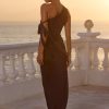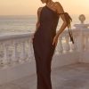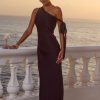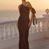 Our Viola Maxi Dress is a unique piece with an asymmetrical neckline that ties at the arm, perfect for a classic look